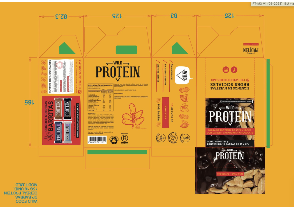 Barra de proteína sabor chocolate y cacahuate, elaborada con cacahuates, dátiles, crisp de soya, proteína de suero de leche, crema de cacahuate natural y chocolate. Contiene 15 g de proteína por porción y no tiene azúcar añadida.