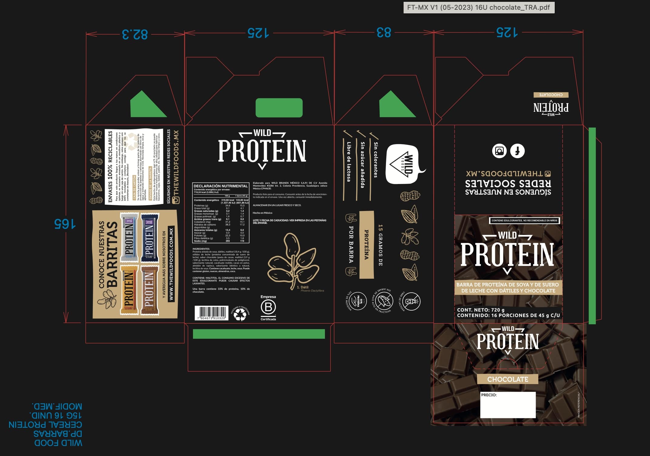 Barra de proteína sabor chocolate, elaborada con dátiles, soya inflada, proteína de suero de leche, chocolate amargo y crema de cacahuate. Contiene 15 g de proteína por porción y no tiene azúcar añadida.