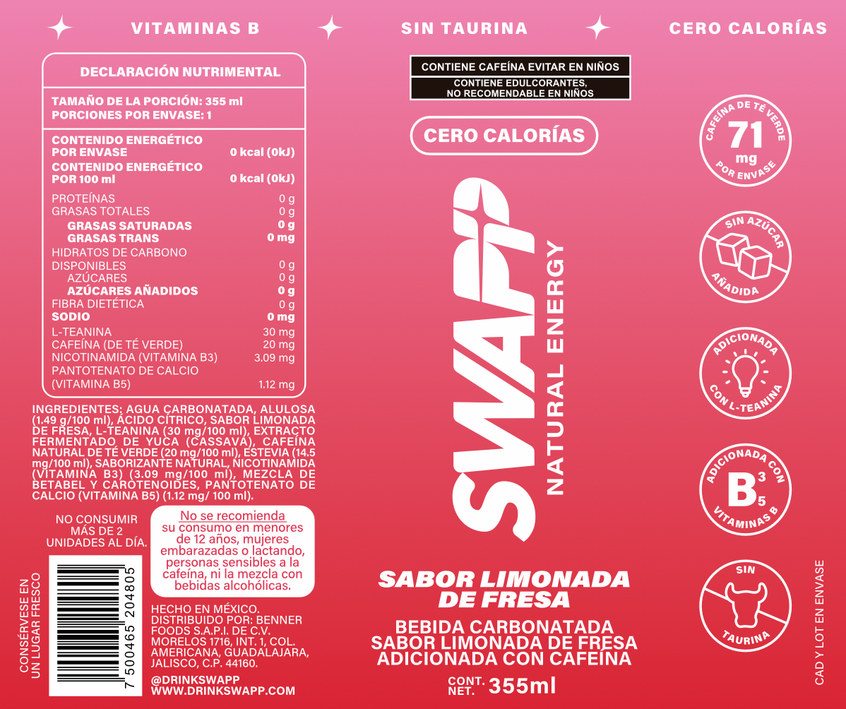 SWAPPP LIMONADA FRESA BEBIDA ENERGIZANTE (12 LATAS DE 355 ML)