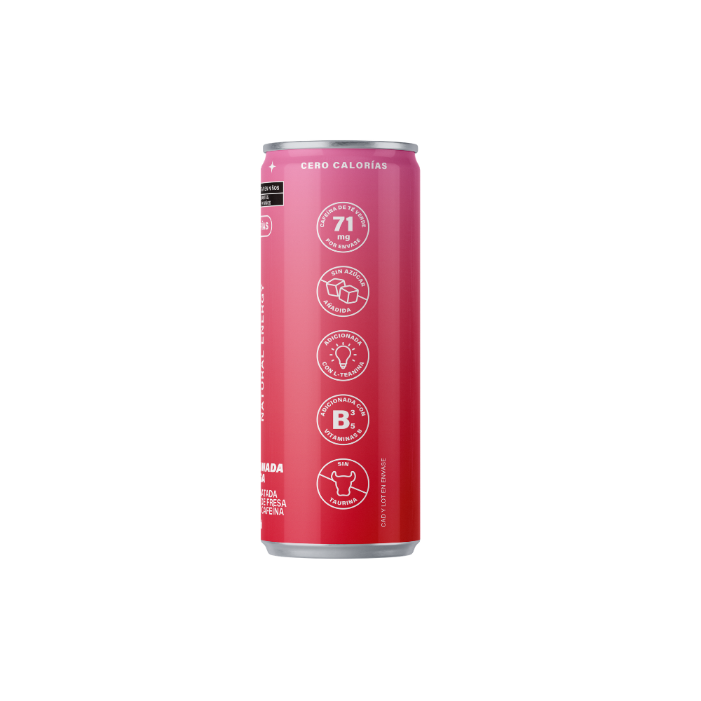 Bebida carbonatada adicionada con cafeína de té verde sabor limonada fresa sin calorías.