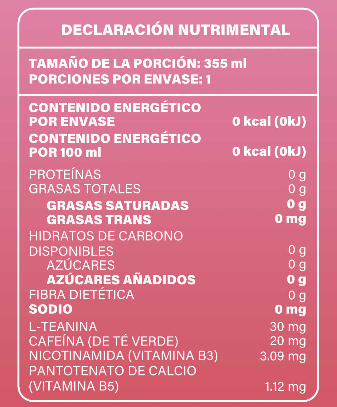 Agua carbonatada / Ácido cítrico / Saborizante natural / Alulosa / Stevia / Panax ginseng / Cafeína natural de té verde / Colorante natural.
