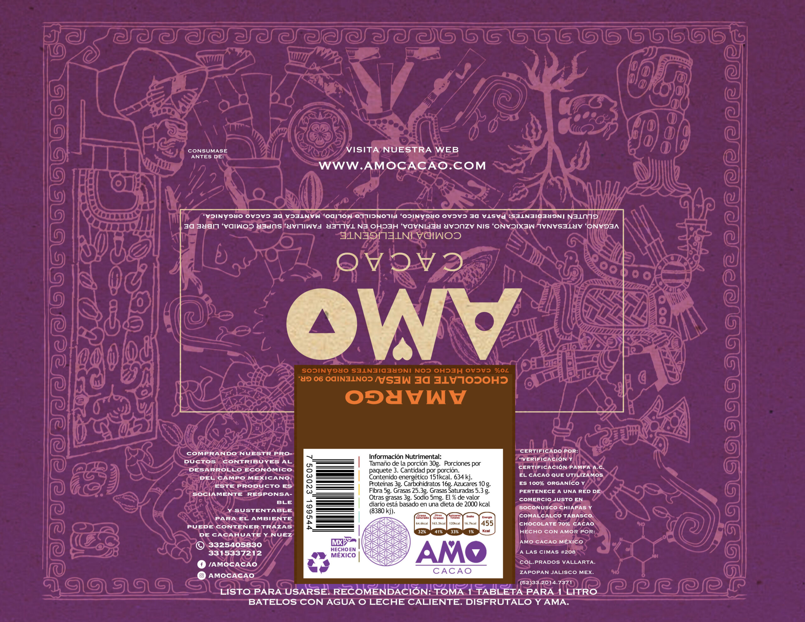 Preparación: agregar 1 tableta del chocolate de mesa amargo Amo Cacao para 1 litro de agua o leche caliente y mezclar hasta disolver.