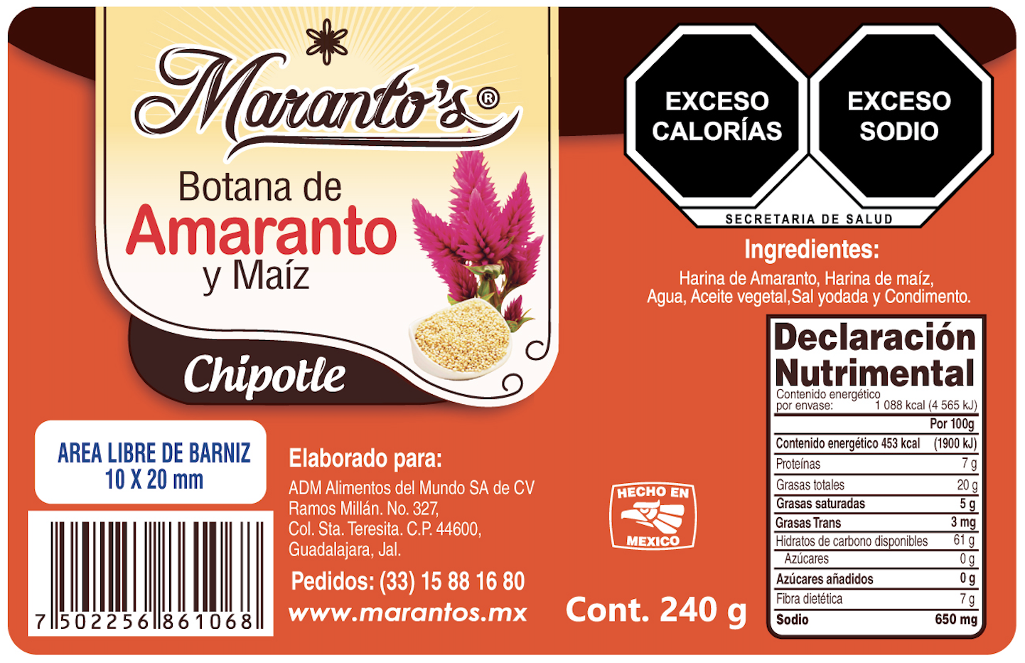 Harina de amaranto./ Cereal de amaranto./ Harina de maíz./ Agua./ Aceite vegetal./ Sal yodada.