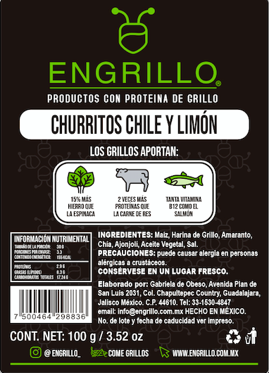 Churritos de maíz sabor chile y limón, adicionados con harina de grillo.