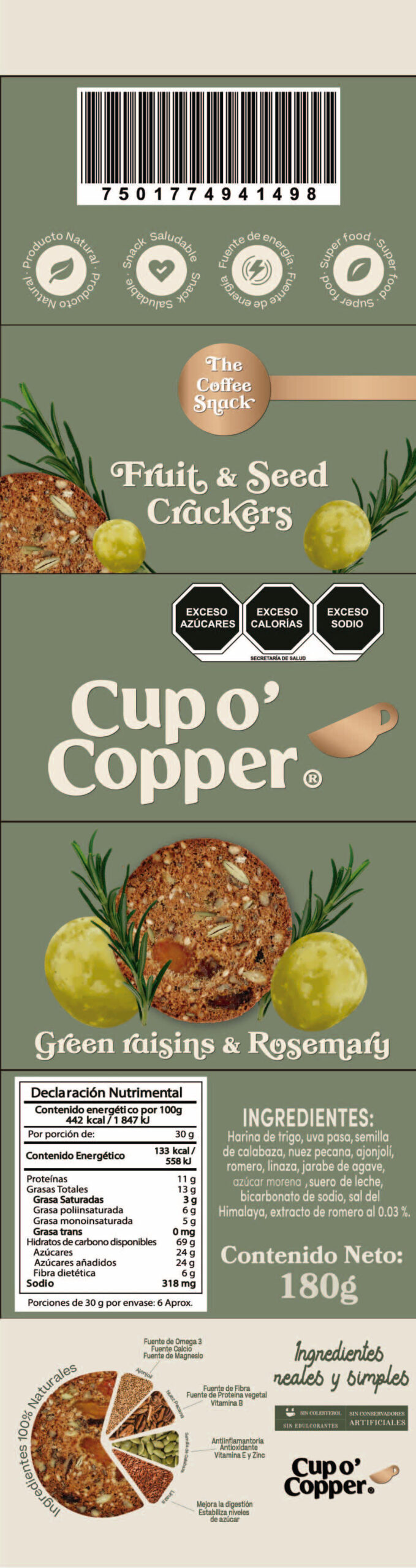 Las Crackers sabor uva romero son una deliciosa y saludable opción para cualquier momento del día.Elaboradas con una mezcla de semillas crujientes, combinadas con frutos secos y uvas deshidratadas que aportan un toque de dulzura natural. Estas crackers se realzan con un delicado aroma a romero, que les otorga un sabor único y sofisticado. Perfectas para acompañar quesos, hummus o simplemente disfrutarlas con una buena taza de café. Son una opción nutritiva y llena de energía.¡El snack ideal para los amantes de lo saludable y gourmet!