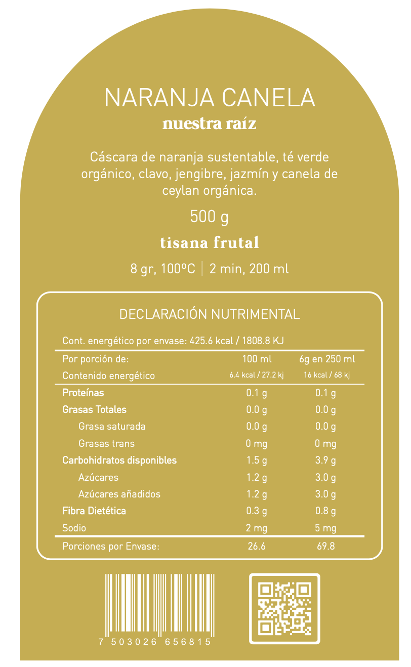 Cáscara de naranja sustentable./ té verde orgánico gunpowder./ clavo./ jengibre./ flor de jazmín ./ canela de Ceylán orgánica.