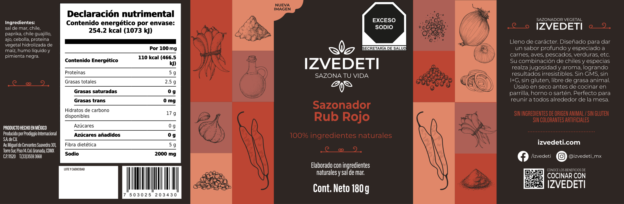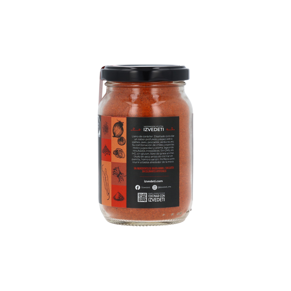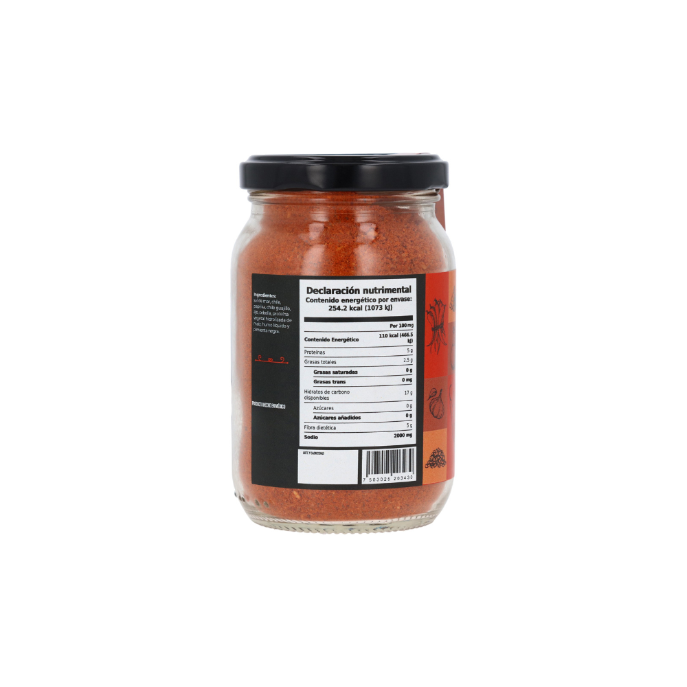 Sal de mar, chile paprika, chile guajillo, ajo, cebolla, PVH de maíz, humo líquido y pimienta negra.
