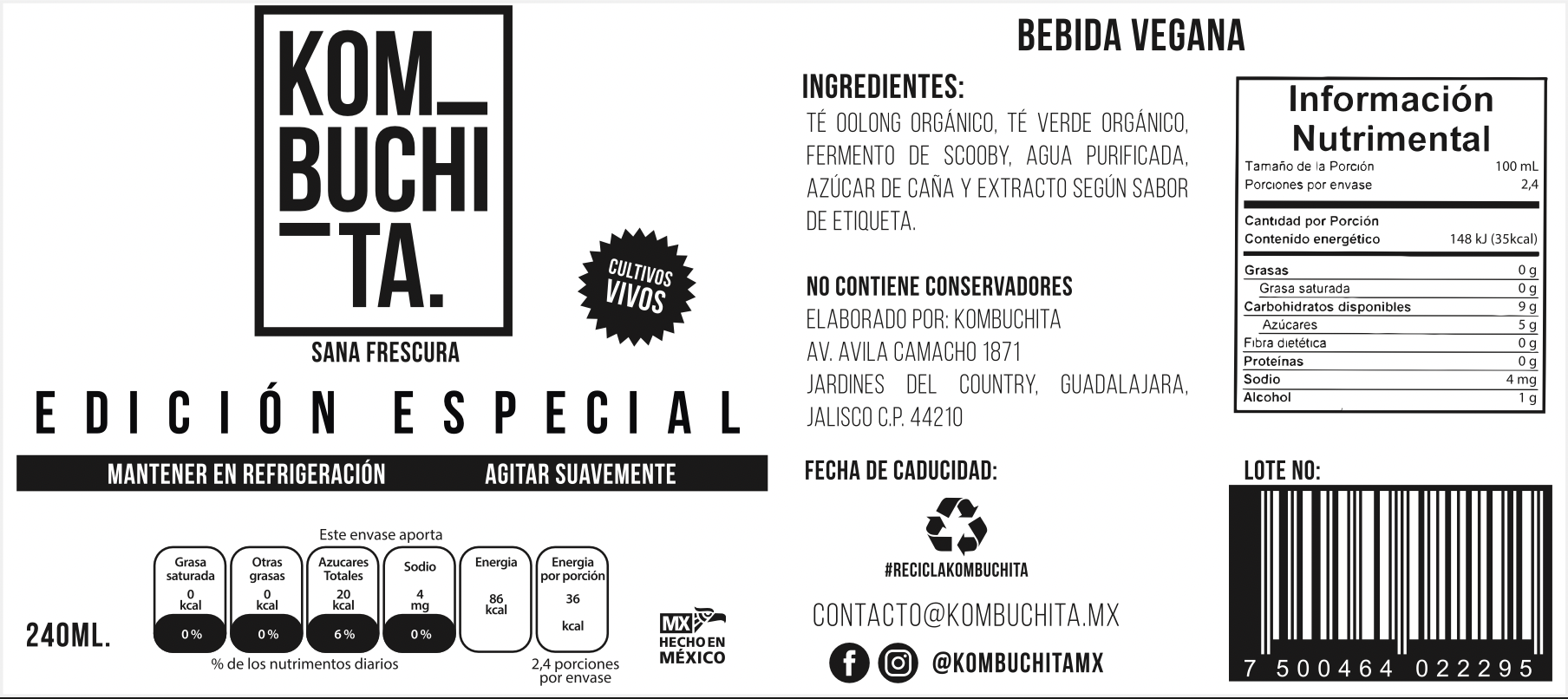 Bebida sabor maracuyá fermentada con ayuda del Scoby (Symbiotic Colony Of Bacteria and Yeast) a base de té verde y té oolong. Es carbonatada naturalmente, lo que la hace ligeramente efervescente y acidita.