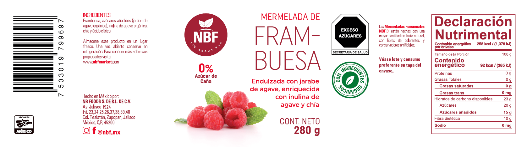 Las Mermeladas NBF están hechas de 55% de fruta de la mejor calidad, endulzada con jarabe de agave orgánico, mezclado con inulina orgánica y chía. No contiene conservadores ni colorantes artificiales.