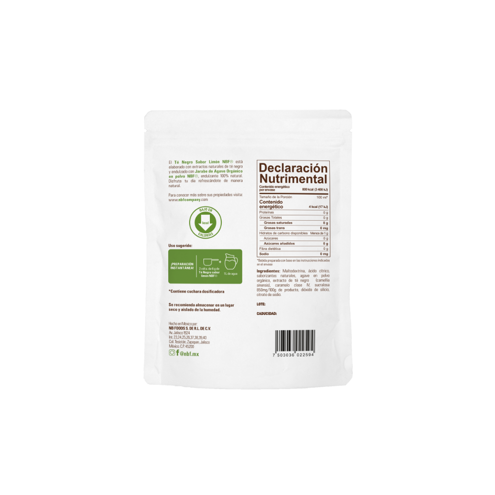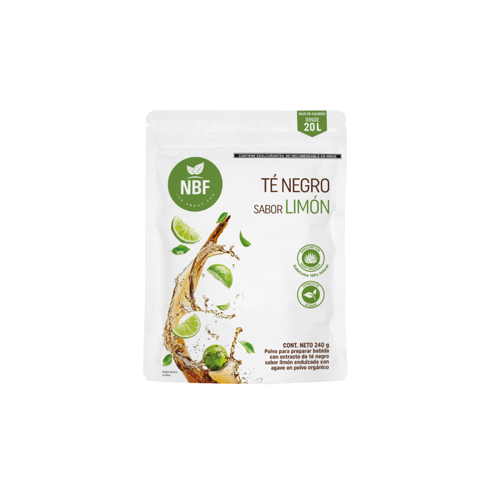 El Té Negro Sabor Limón NBF está elaborado con extractos naturales de té negro y endulzado con jarabe de agave en polvo, endulzante 100% natural. Disfruta tu día refrescándote de manera natural