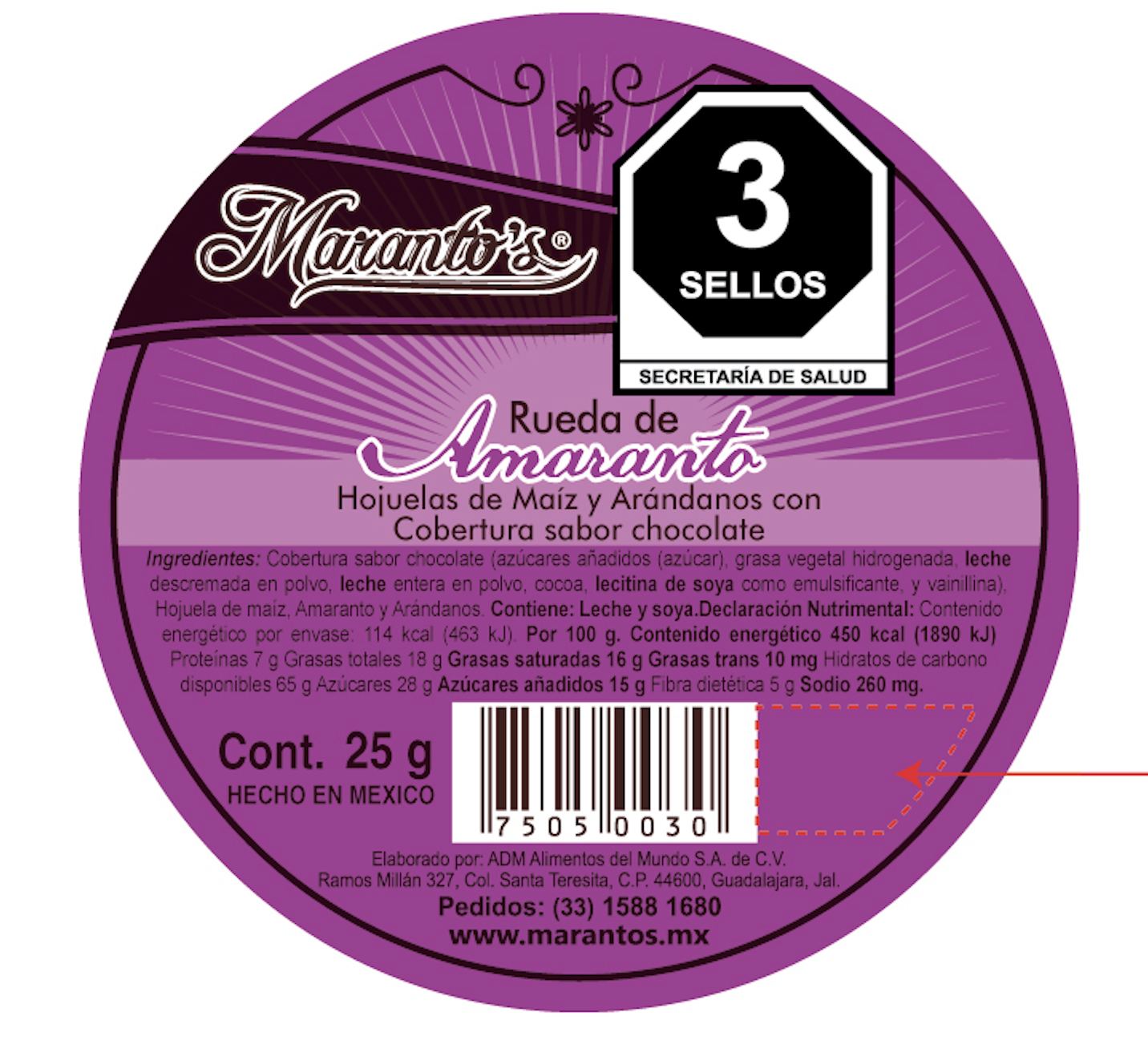 Alegría de cereal de amaranto con cobertura sabor chocolate, hojuela de maíz y arándanos.