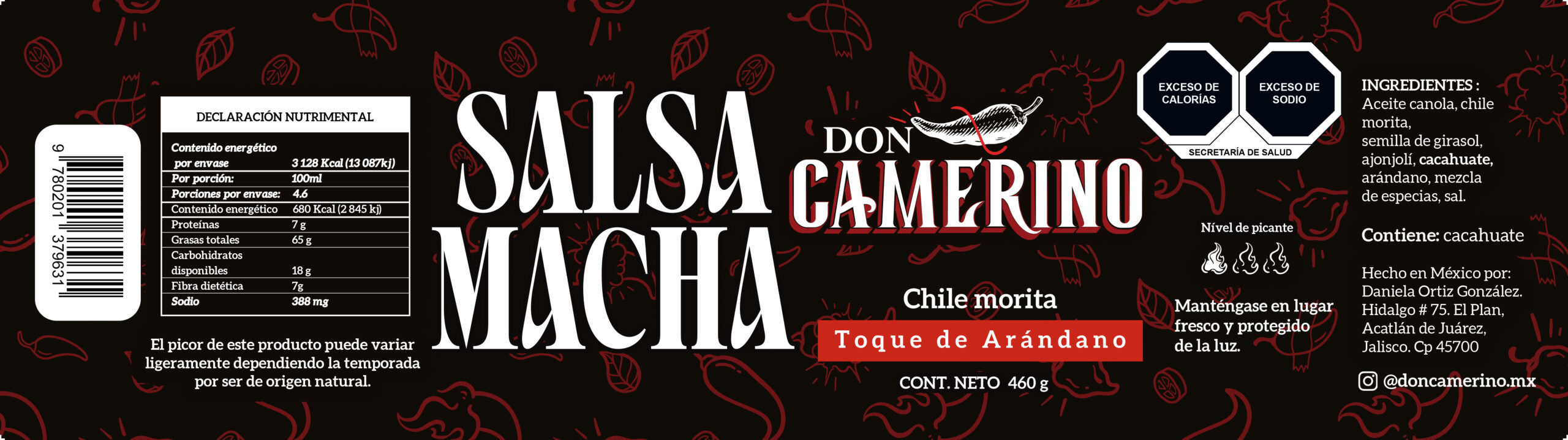 Salsa macha elaborada artesanalmente, hecha a base de aceite canola, chile morita, arándano y variedad de semillas.