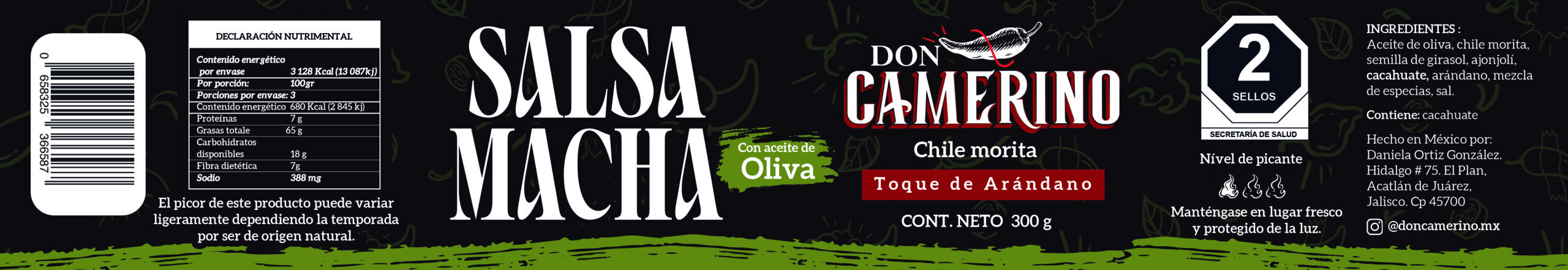 Salsa macha elaborada artesanalmente, hecha a base de aceite de oliva, chile morita, arándano y variedad de semillas.
