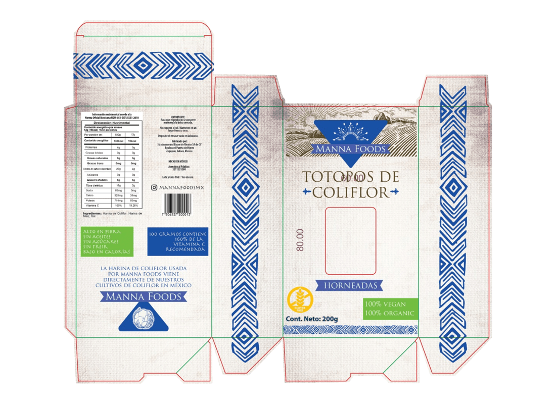 Totopos horneados hechos con harina de coliflor proveniente de cultivos mexicanos. Son ricos en vitamina C, fibra y muy bajos en calorías.